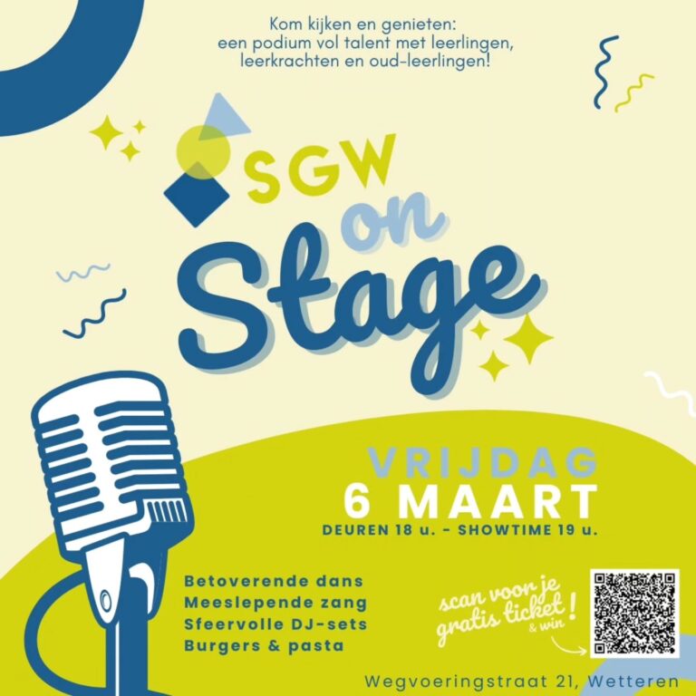 SGW on stage SGW on stage Op vrijdag 6 maart openen we vanaf 18 uur onze deuren voor een avond vol muziek, zang, dans & DJ-sets! Op het podium: leerlingen, collega’s en oud-leerlingen Drankjes aanwezig Geniet van pasta of spitburgers Gratis tickets via de QR-code op de affiche Maak kans op een leuke prijsKom supporteren, genieten en meezingen Link gratis tickets: https://bit.ly/SGWonStage